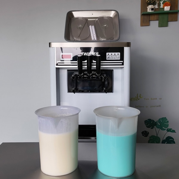 We still use Frostyboy brand Vanilla soft ice cream powder. 1.5kg ice cream powder + 3.5L normal temperature water (24 ℃) and mixture evenly, let it stand for 15 minutes, and then pour it into the ice cream machine hopper.